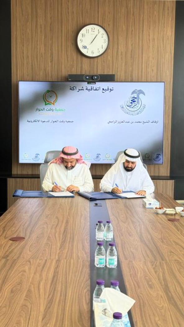 انطلاقًا من قوله تعالى: ﴿وَمَن أَحْسَنُ قَوْلًا مِّمَّن دَعَا إِلَى اللَّهِ وَعَمِلَ صَالِحًا﴾ وضمن جهودها في تمكين العمل الدعوي الإلكتروني، أبرمت أوقاف الشيخ محمد بن عبدالعزيز الراجحي اتفاقية شراكة نوعية مع جمعية وقت الحوار للدعوة الإلكترونية، يوم الأحد 26 ذو الحجة 1446هـ الموافق 22 يونيو 2025م، وذلك لدعم وتنفيذ مشروع نوعي يعزز من حضور الإسلام عبر المنصات الرقمية، ويستهدف غير المسلمين حول العالم.